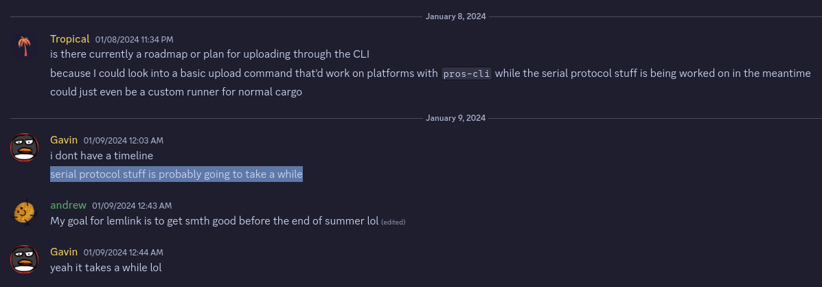 This isn’t to fault the PROS project or anything, their CLI works great for them where everything is included with a VSCode extension by default, but we’re working with Rust tooling here and instructing users install an entire python toolchain to upload programs became a little unreasonable.